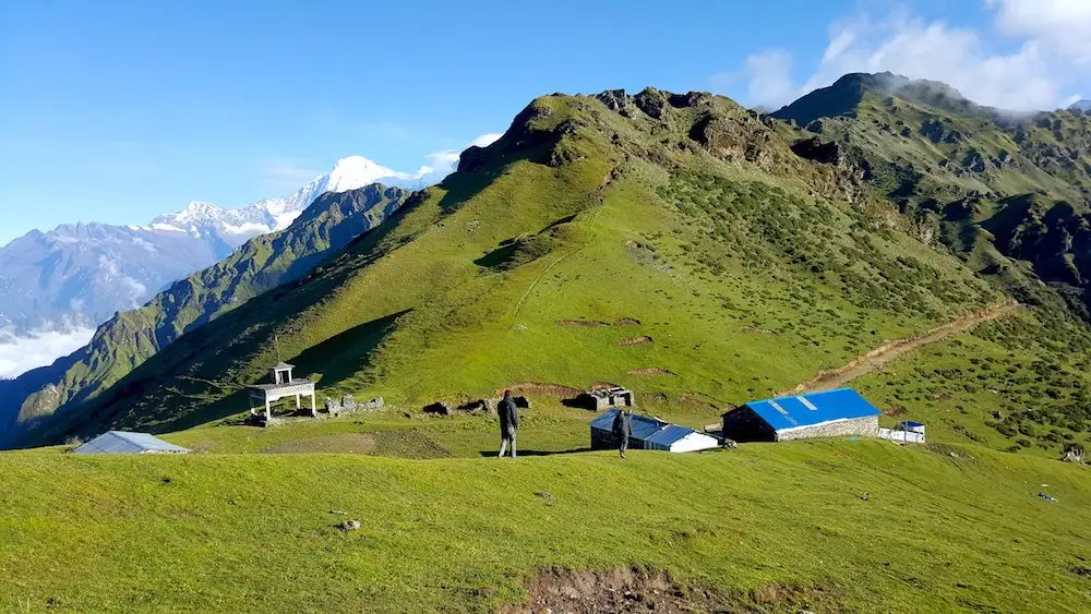 Today we follow the trail back the way we came descending towards the pastures of Rajgang Kharka. Tonight we will stay in a tent. Breakfast, lunch & dinner provided.